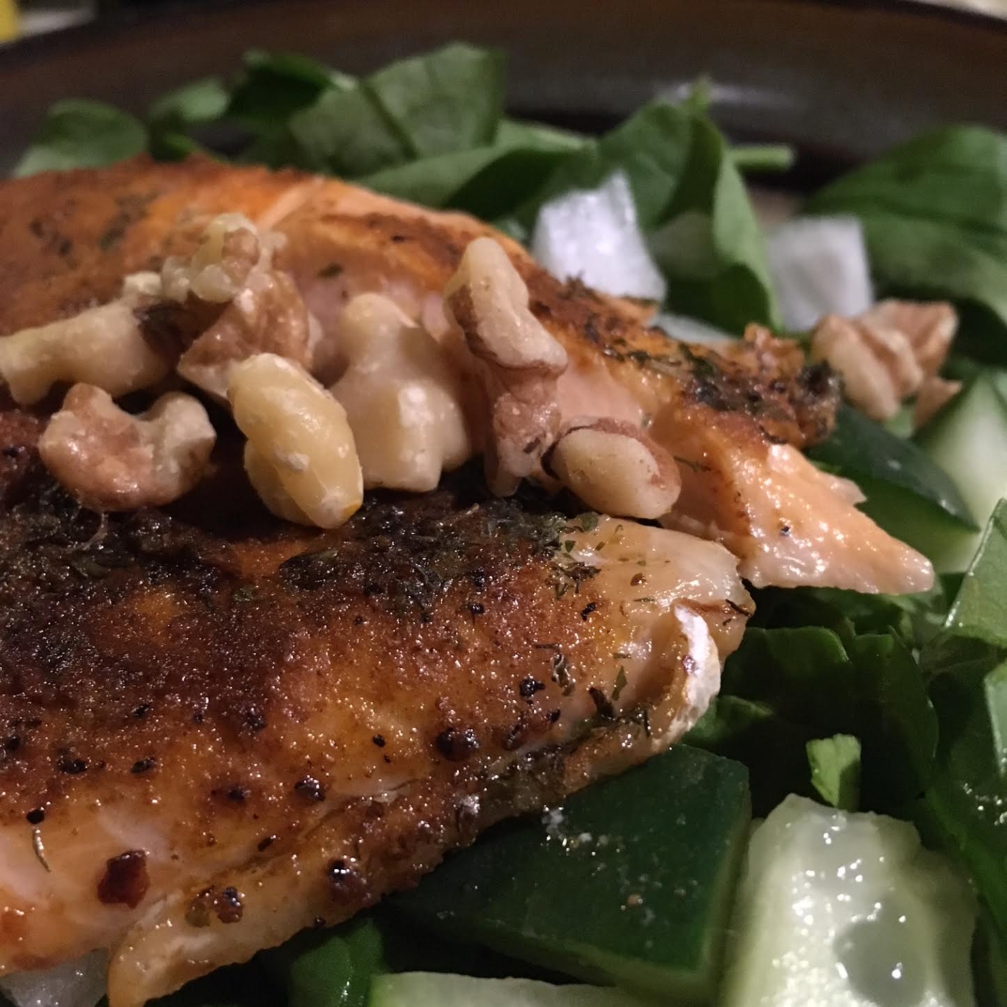 In a separate bowl, mix together the ingredients for the dressing, including 2 tablespoons of olive oil, 2 tablespoons of apple cider vinegar, 1 tablespoon of lemon juice, 1 teaspoon of dijon mustard, 1 teaspoon of honey, and salt and pepper to taste. Toss in with the salad and top with fresh-from-the oven salmon. Sprinkle chopped pecans or walnuts to add some crunch.