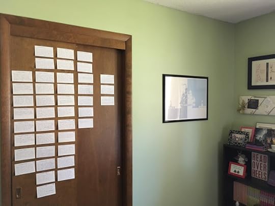 It seemed like such a waste to set those index cards aside, never to be used again. And, now that I have my own office for creating, I figured I'd give them new life by hanging them on the closet doors in my office. They're not completely organized by acts, but that's not a totally incorrect way of looking at it. Mostly, there's the beginning. There's the ending. And then the middle is split into two parts that make sense to me and where the characters are on their development arc.