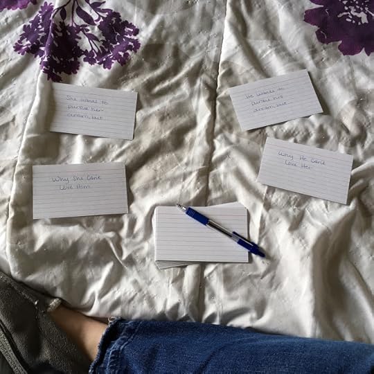 This time (also at the advice of a local RWA member) I used index cards to brainstorm conflict and tension that would keep the story going. I asked why can't she/he love him/her? And I focused on what stands in the way of her/him fulfilling their main goals.