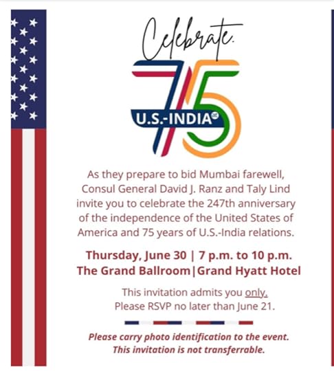 Being invited to share in the celebrations of the 247th anniversary of the independence of the USA and 75 years of US-India relations last evening was surreal, while also braving the drenched monsoonal roads. But most importantly meeting with fantastic old and new associates and acquaintances of the US Consulate Mumbai was an unparalleled gladness.