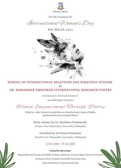 For International Women’s Day, the University of Mumbai will release, ‘Women Empowerment Through Poetry’ – an anthology of poems, edited by Arushi Sharma, Aishe Debnath, Manisha Karne, Aparna Phadke, Satishchandra Kumar, and Rajesh Kharat. Glad to be reading my poems at this august gathering on Tuesday, 8th March 2022, 5 pm.