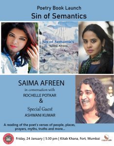 You are gorgeously invited to the book launch of Sin of Semantics by Saima Afreen on 24th January 2020, Kitab Khana, Fort, Mumbai.