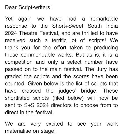 I had no clue I was a playwright – not even by an inch, atom, or iota. But the short film scripts I adapted to 10-minute plays (Fishbowl and Catharsis) have been shortlisted at the Short+Sweet South India 2024 Theatre Festival for directors to direct. 18 such 10-minute selected plays will be showcased this September at Prakriti Foundation.