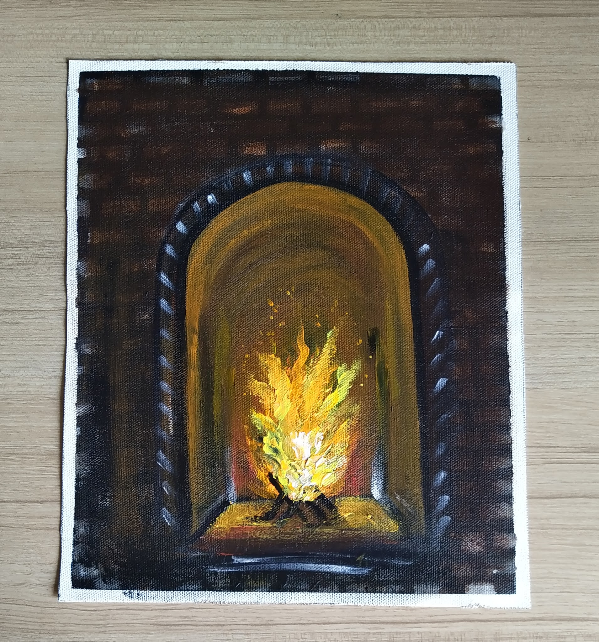 (A fireplace study. My first attempt. I always wanted to paint a fireplace. Not very happy with this but I painted it for this story. Acrylics on canvas)