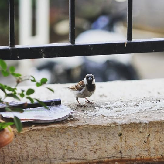 बैगनी फूलों पर मंडराती है ये गौरैया जो फुदक कर अभी-अभी खिड़की पर आ बैठी है, ऐसा लगता है