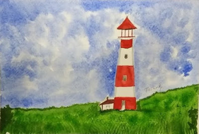 Lighthouse pictures attract me, so I tried to paint. I am very bad at sketching; can't even draw a straight line. Thankfully, my sketch seems acceptable. Or does it look like it's going to fall any time?