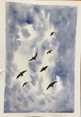 I've been thinking of doing different versions of sky, so tried. Painted this grey sky. Flock of birds, going home in the evening, always attracts me.
