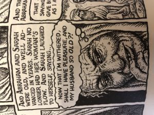 The second place is today’s passage in Genesis 18. Her husband entertains God himself unawares while Sarah eavesdrops from the flap of the tent. Her back is bowed. Her hair is thinned. Her hands are palsied and liver-spotted. She’s all gums. She’s got just a few teeth, which is fine because all of her appetites are about gone. She’s closing in on 100 years old.