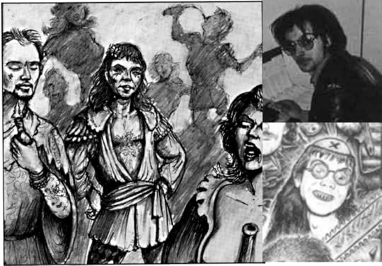 Tony Ackland is not to be outdone. The cultists of the Jade Sceptre include Rick Priestley and Sid, who was a Citadel figure painter at the time. Sid, an outlaw biker through and through, was not too pleased with being depicted as a Slaanesh cultist.