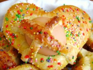 Italians color Easter eggs like we do. And then they bake them into sweetened brioche bread in a variety of shapes. There are some with a cross (like the one pictured below), but many of them are braided or resemble chickens. Il pane di Pasqua is also called pane pasquale, so if you know a Pasquale, you now know what his name means.