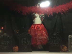 By the way, besides Vaxing for Vomen, there is also a creepy old cemetery on North Loop, kind of like the one across the street from where Franki, Veronica, and Glenda live. There is also a sex shop called “Forbidden Fruit.” I snapped this picture of one of its shop windows on a recent nighttime dog walk because it reflects a few of the key elements in AMARETTO AMBER—pasties, a feather boa, and tombs…
