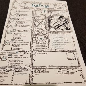 Saturday night involved a tradition for me and a bunch of friends. Whenever we’re all able to attend the same convention, one of us runs a tabletop RPG. This year it was Alis’ turn, and the game was Dungeons and Dragons 5E. Being a talented artist, Alis made us some stunning character sheets.