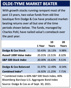 AFTER A 13-YEAR drought, value stocks surged over the past year, and arguably no fund rode the wave better than the venerable Dodge & Cox Stock Fund (symbol: DODGX), which was launched in 1965. Long one of the largest and most respected mutual funds, it’s run by a nine-member investment committee, though the fund is perhaps most associated with Charles Pohl, who has been a manager for 30 years and is set to retire in 2022. Turns out he’s beaten the market the entire time.