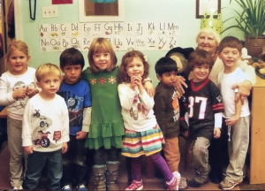 Milly taught the children how to sew, using plastic needles and yarn on cardboard punched with holes. She was the queen of Go Fish and Bingo. Every Milly visit was a very good day at school. Often the children made things for Milly. We were in the middle of learning about kings and queens, and children wanted to make Milly her own crown.
