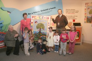“Peace Quilt” designed by students at the Groton Community School, Groton, Massachusetts. Their teacher, Ms. Jennie Fitzkee, conceived this project after visiting the National Liberty Museum two years ago. She saw many visions of peace displayed throughout the Museum, which made her wonder how her young students would interpret this concept. With the help of a beloved classroom puppet named “Gloria”, Ms. Fitzkee inspired the youngsters to draw their ideas of “Peace.” Quilter Milly Cunningham used their illustrations of rainbows, happy animals and even trucks to create this beautiful quilt. The National Liberty Museum is grateful to Ms. Fitzkee and her students for this wonderful gift.