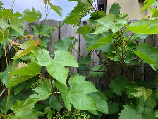 As I was scanning the scenery for poetic prompts on Saturday, I was amused to find myself drawn to the burgeoning vine leaves in our garden which had been the unsuspecting victims of a mass hack down by Android last year. Wise to the error of his ways, Android has taken a more gentle approach to his pruning this year I am relieved to say. The vines, so they tell me, were pleased to find their voice in the following poem penned on the morning of my Poetrython.