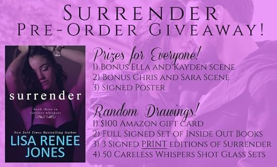 To celebrate the upcoming release of SURRENDER, the Careless Whispers finale, I’m hosting a HUGE giveaway with guaranteed prizes for EVERYONE as well as a lot of grand prizes too!! The only qualifier to register to win and for your goodies is to pre-order SURRENDER on any of the retailer sites below (Ama...