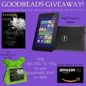 To celebrate the upcoming release of I BELONG TO YOU (Inside Out #5) on November 18, 2014 I’m hosting a HUGE giveaway! I’ll be gifting a brand new Dell Venue 7 tablet plus an I BELONG TO YOU tote bag with swag for a grand prize, a $50 Amazon gift card to the second place winner, and 10 I BELONG TO YOU tote bags!