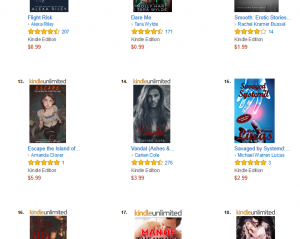Hot new releases only include titles released in the last little while. It doesn’t mean much compared to the general “books that are best-selling right now” list. So here’s a screenshot of Amazon’s erotica best-sellers from last night.