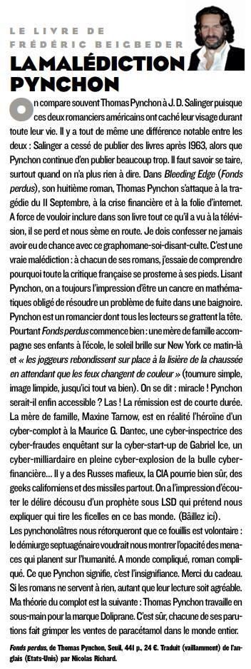 Ce n'est pas digne, monsieur Beigbeder. Ce n'est pas honnête. Soit vous êtes infoutu de vous attaquer à autre chose qu'une histoire simple avec un style simple sujet-verbe-et-complément-à-la-rigueur, et alors, ce serait gentil de faire votre coming-out une fois pour toutes ("alors voilà, les gars : pour moi, un roman, c'est un script de ciné avec des adverbes, et ceux qui pensent le contraire sont des snobinards élitistes aigris qui vont tuer la littérature"), soit vous y croyez quand même un peu, au roman, et alors, par pitié, par respect pour ses lecteurs et pour vous-même, évitez de parler de Pynchon. Dans ses meilleurs moments, votre diatribe évoque le reniflement hautain d'un ado de 14 ans devant une toile de Rothko : "je peux en faire autant." Mais les ados grandissent, monsieur Beigbeder. Ils peuvent même apprendre. Apprendre Pynchon, on vous l'accorde, ça prend du temps, ça demande quelques efforts. Évidemment, ces efforts seront récompensés au centuple ; voire : ils feront de vous un autre lecteur et, sans doute, c'est ce qui vous fout un peu les jetons, ça peut se comprendre - vos rédac-chefs risquent de hausser un sourcil. Le fait est là, cependant : quiconque est un jour "entré" en PynchonLand, quiconque a jamais ressenti ce frisson d'exaltation inouï résidant précisément dans le fait de ne pas tout "comprendre" sinon le fait qu'il était vital de se déprendre de la limpidité ("[...] Rappelez-vous que la simplicité, c’est de la foutaise ! clamait Nabokov devant ses étudiants endormis. Aucun grand écrivain n’est simple. Le Saturday Evening Post est simple. Le style du journaliste est simple. Upton Lewis est simple. Maman est simple. Les “digests” sont simples. La damnation est simple. Mais les Tolstoï et les Melville ne sont pas simples."), quiconque s'est senti brinquebalé par la langue magique du maître comme un rondin de bois emporté par un fleuve puissant vers mille chutes joyeuses et folles sait ce que la littérature doit à ce bon vieux Thomas. Beigbeder, lui, ne le sait pas, et je suis sincèrement très triste pour lui. Mais que faire ? Acquiescer, sourire compatissant aux lèvres, au récit de sa non-rencontre absolue avec l'un des plus grands auteurs actuellement en activité ? Applaudir à ses éternelles bravades d'ado attardé ? Que reste-t-il, à ce stade, à lui conseiller ? Essayer Tom Robbins ? Revenir à la pub - comme s'il l'avait jamais quittée ? Ou, simplement, lui suggérer d'arrêter avec tout ça ?