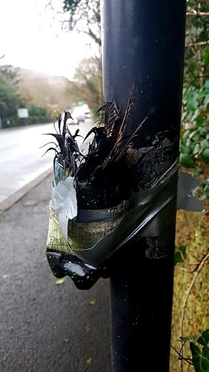 This one is truly sinister- a plastic bottle stuffed with crow feathers. What does it mean? Who is this for?