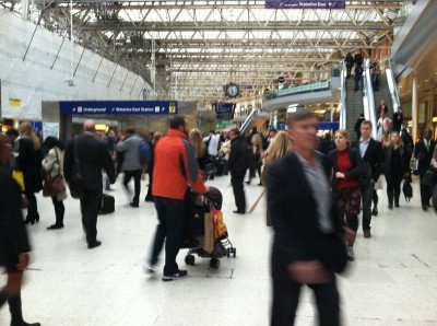 Waterloo throbs day and night with interesting characters: cyclists in sober business suits and helmets making their daily commute to nearby bedroom communities; stalwart girls with rolled-up bedding and serious boots who look as if they’re prepared for months of outback living; and on Sunday nights, the still-single working kids who have been home to mummy for the weekend and are dragging their carry-ons back to their town flats. There are families with packs of children straggling along, lone young mothers trying to manage cranky toddlers and enormous prams — an impossible job even for a three-armed person; house painters smudged from their daily labors; upper-crust kids in their crested blazers cracking jokes with each other; dressed-up suburban women going into London for shopping and lunch. I’ve seen people wrestling with lumber they’re taking home for DYI projects, and people hauling everything from portable air conditioners to ladders. Somehow, passengers adjust themselves to make way for the bulky stuff, and sometimes actually assist the poor bloke who’s dragging it. And there are always dogs, too, which behave nicely as a rule. Better than the children, sometimes.