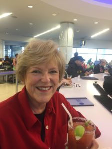 Notice the fake grin and the bad hair day. I was facing 12 hours mashed into a hard pleather seat in a throbbing flying bus packed with several hundred other souls.I was trying to put on a happy face and fortifying myself with a generous bloody Mary before marching down that crowded narrow gangway to the plane, my carry-on bumping behind me. The libation was my sweet Tim’s brilliant idea. He knows how to treat a girl!