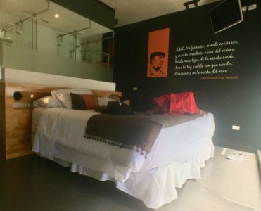 I’m the lump on the bed five minutes after we got there – dead to the world. Clearly, I couldn’t be bothered to put away my tennies. Notice the Neruda poem stenciled on the wall. His home was nearby.