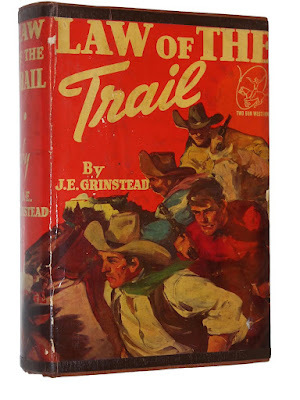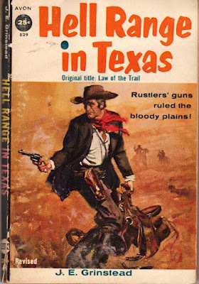 Recently I read some pulp stories by J.E. Grinstead that I enjoyed, so I decided to pick up a novel by him and give it a try. HELL RANGE IN TEXAS is a 1958 paperback from Avon that was published originally under the title LAW OF THE TRAIL as a 1940 hardback by Dodge Publishing, one of the lending library publishers. This is probably an expansion of Grinstead’s novella “The Law of the Trail Herd”, which appeared in the September 1926 issue of the pulp THE FRONTIER. The Avon paperback I read (that’s my copy in the scan) says that it’s revised, but I don’t know what that revision consisted of. It’s possible Grinstead just went back to the pulp version after adding material to make it longer for the hardback edition. That’s pure speculation on my part, however, just the sort of thing that makes sense to me.