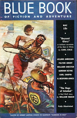 Herbert Morton Stoops painted all different sorts of covers for BLUE BOOK, including action-packed scenes like this one. While some are better than others, of course, he was a great cover artist and I've never seen one I didn't like. The fiction in BLUE BOOK was just as consistent as the covers. Of course, it helps when you have three stories by H. Bedford-Jones in an issue. In this case, there's one under his own name, one with his fictional collaborator Captain L.B. Williams, and one as Gordon Keyne. Also on hand are adventure pulp stalwarts Fulton Grant, Leland Jamieson, Warren Hastings Miller, William J. Makin (with a Red Wolf of Arabia story), William L. Chester (with an installment of a Kioga serial), and lesser-known writers Carl Cole and C.M. Chapin. This is the only story by Carl Cole listed in the Fictionmags Index. Who knows, maybe he was H. Bedford-Jones, too. You can't rule it out.