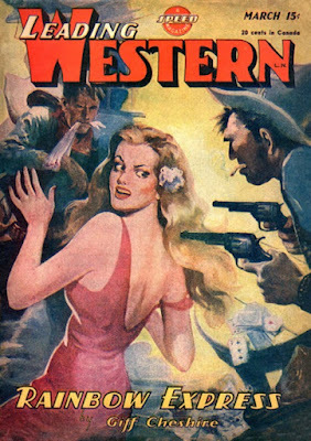 Since LEADING WESTERN was published by Trojan, making it a Spicy Pulp at least by association, you'd expect the covers to have attractive women on them, and the March 1946 issue is no exception. I don't know who painted this cover, but if I had to guess, I'd say H.W. Scott. The big galoot with the dangling quirly looks like his work. Inside this issue, the only author you've likely heard of is Giff Cheshire, whose story made the cover. The other writers on hand are Adolph Regli, Frank D. Compagnon, Henry Norton, and Mark Lish. Norton and Lish sound vaguely familiar to me, the other two not at all. I don't own this issue and wouldn't want to venture a guess as to its quality, but the cover is okay.