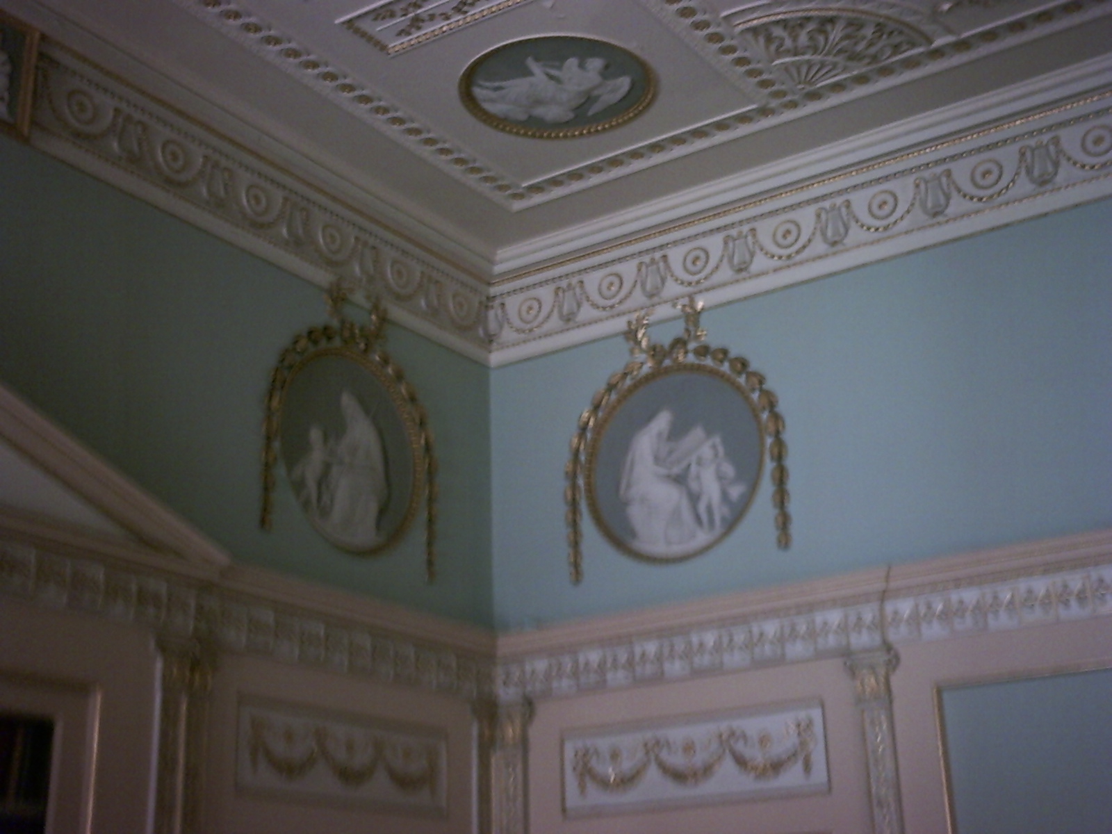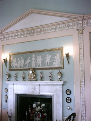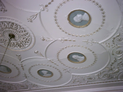 Library, Berrington HallThe library at Berrington has several interesting features for the historical author. The picture above (apologies for the quality) does not show the pediment on the fitted bookcases designed by Henry Holland, but it is reflected on the pier-table and over the fireplace, as are the narrow Ionic pilasters. A ‘Greek key’ decoration, embellished with mistletoe berries, links the various features. The frieze above has some lovely classical plasterwork to reflect the origins of the architecture, and on the ceiling there are ‘portrait medallions’, attributed to Biagio Rebecca, according to the guidebook, commemorating various famous authors. These are, clockwise from the fireplace, Matthew Prior (poet, political ally of Robert Harley), John Milton, Alexander Pope, William Shakespeare, Geoffrey Chaucer, Isaac Newton, Francis Bacon and Joseph Addison.