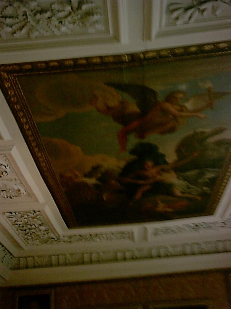 We continued our tour of the ground floor, progressing via the Smoking Room to the Dining Room, once part of Thomas Vernon’s own apartments. In about 1830, a wall was removed and the ceiling aligned to conjoin his withdrawing room and lobby. On the ceiling of the Dining Room (Withdrawing Room) are two more Thornhill paintings, one of the North Wind, Boreas; the second of Apollo and his chariot. My apologies for the quality of the photo.