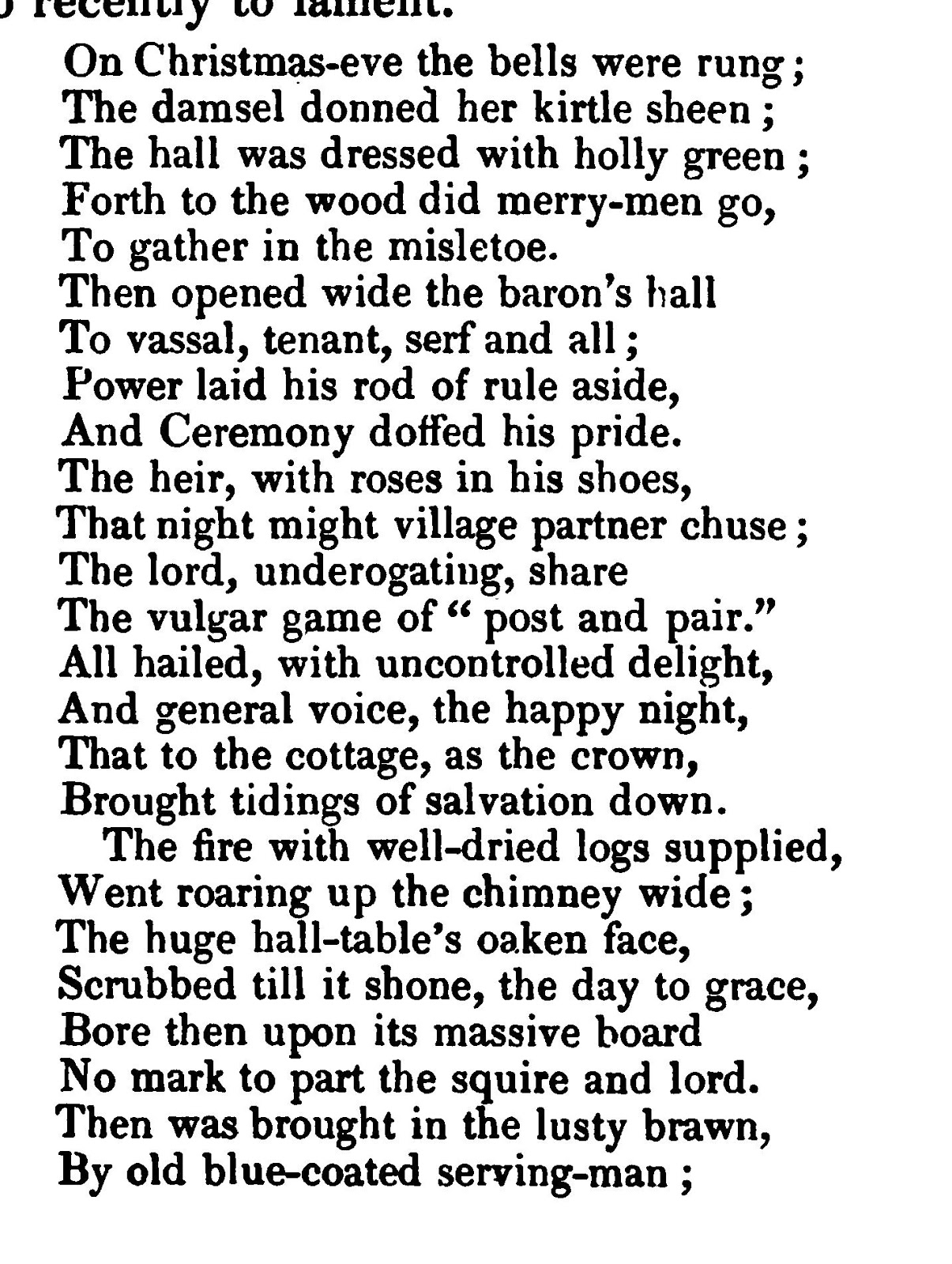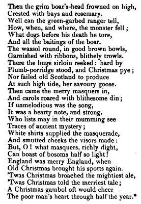 Behold a personage well known to fame;Once lov'd and honour'd - Christmas is my name!My officers of state my taste display;Cooks, scullions, pastry-cooks, prepare my way!Holly and ivy round me honours spread,And my retinue show I'm not ill-fed.Minc'd pies by way of belt my breast divide,And a large carving knife adorns my side;'Tis no Fop's weapon, 'twill be often drawn;This turban for my head is collar'd brawn!Tho' old and white my locks, my cheeks are cherry,Warm'd by good fires, good cheer, I'm always merry:With carrol, fiddle, dance and pleasant tale,Jest, gibe, prank, gambol, mummery and ale,I, English hearts rejoiced in day of yore;For new strange modes, imported by the score,You will not sure turn Christmas out of door!and though I come out of Pope’s-head alley, asgood a Protestant as any in my parish...