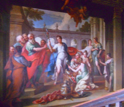 We then returned to the house for a guided tour, something I had always missed on previous visits. The house dates from 1701, according to the date on the stone plinth over the doorway, but this may be disputed. The house was built by wealthy lawyer Thomas Vernon, although the estate was bought by his grandfather Edward Vernon in 1631. Somehow, Thomas persuaded Court painter Sir James Thornhill (the first English artist to be knighted) to travel into Worcestershire and execute various paintings in the house. Hanbury Hall is justifiably proud of the works, particularly the staircase murals. According to Nikolaus Pevsner, the staircase dates from c. 1710 and can be compared with those at Hampton Court, Drayton and Boughton, both in Northants. This then dates the paintings to that time. The main mural depicts Achilles being found by Odysseus.
