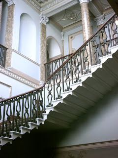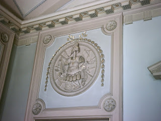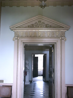 Through Staircase Hall, Berrington HallThere are tapestries on the walls, but they date only from 1902. This was a country gentleman’s seat and therefore more modest. Some of the grandest houses of the Georgian era have rococo plaster mouldings in elaborate panels, often in the classical designs of urns, wreaths and garlands. This is a picture of some of the plasterwork at Berrington.