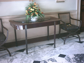 The Drawing Room was for show rather than relaxing, unlike our lounges and sitting rooms today. They were furnished with delicate, spindle-legged chairs and sofas, often with pie-crust or marquetry-topped occasional tables nearby for the convenience of guests. Side tables (not to be confused with those employed for personal use) were rectangular pieces of mahogany or, in an earlier age, walnut, set against a wall for the displaying of ornaments, silverware or a drinks tray. Often incorporating a pier-glass (large mirror) above, in many cases they are not free standing, having only two legs. Small groups of chairs encouraged diverse conversations among house guests. For more informal use, the lady of the house might well have a smaller parlour for her personal or family use, which, in all likelihood, would contain a desk, armchairs and a cabinet. She might keep her sewing box here, too.