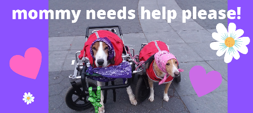 We are paralyzed doggies Mr. Simeon and Miss Mercy whom Mommy took under her wings years ago when nobody else wanted us since we were paralyzed and needing lots of long-term love & help that lots of people wouldn’t want to do because of all the time and sacrifice and care involved……..