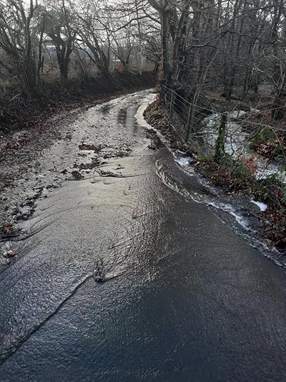 Last night it rained continuously and when Swingle and I trotted up the road, it was awash. Culverts overflowing down like a small sea.