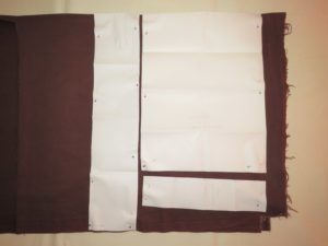Fold material in half and pin pattern pieces into place. Cut out. Make sure you don’t cut along the fold (shown at the top of the following image).