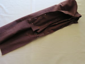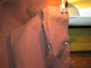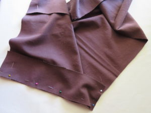 Turn the material so the second side can be pinned to the body of the satchel. It is important that the sides of the satchel both reach the same point on the body of the satchel. (When pinning the corners, the material of the body of the satchel will be rounded. This will be sorted during the sewing stage.)