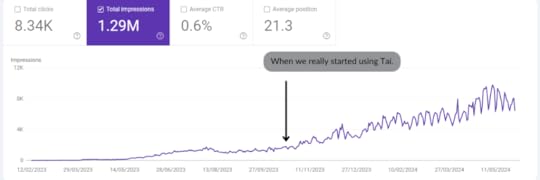 Google Search Console data for Tour My Germany from February 2023 to May 2024 (16 months), clearly showing the accelerated growth after Eran started using Tai for content creation.1. What is your process for deciding which topics to write about? Has your process changed since Tai was launched?