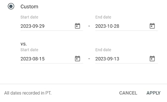 Then set up your comparison dates like this:Note: the Google Helpful Content update rolled out between September 14th and 28th, 2023, so the comparison should exclude the rollout dates.