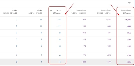 This comparison view displays which pages were impacted most. It compares the data across the “Clicks” columns and also across the “Impressions” columns.