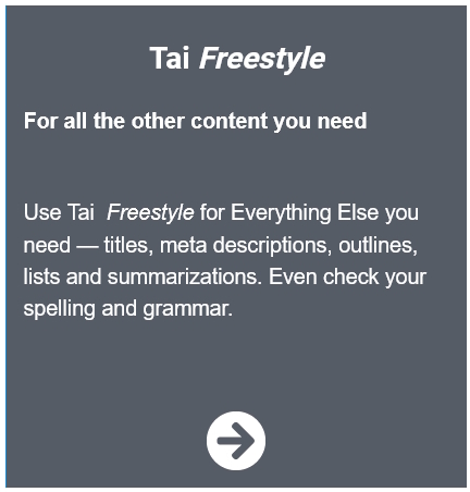 Improve Your Writing With Tai FreestyleApply the power of Tai Freestyle to your writing and watch as it changes the way you create content. Tai is the perfect writing assistant to spark new ideas, weave together compelling articles, and finalize it all with flawless grammar.