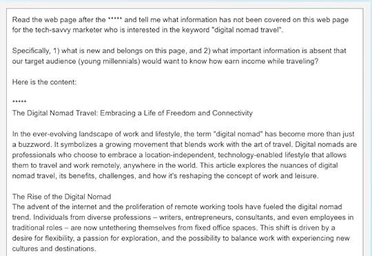 Find a page in your Algorithm Fix Tracker that’s not performing well.Open that page in your browser and copy all the content.Paste it into the Tai Freestyle prompt box.Just before the pasted content, type your prompt at the top of the box. Here’s an example prompt to try. Be sure to replace the words inside the <>’s with your information. Like this:Read the web page after the ***** and tell me what information has not been covered on this web page for the who is interested in the keyword “.”Specifically, 1) what is new and belongs on this page, and 2) what important information is absent that our target audience () would want to know about ?