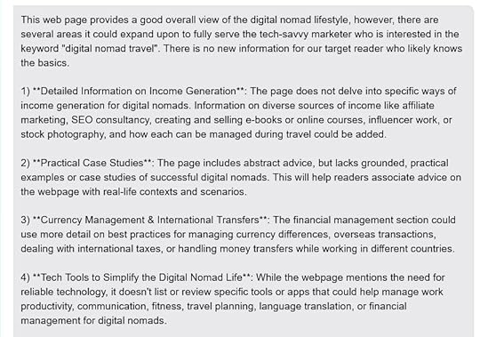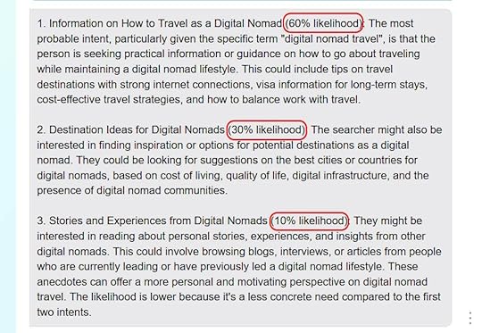 Suppose a person is searching Google using the term “,” where we don’t know anything more about the searcher. List the three most likely search intents in order from most to least likely. Specifically, what do they most want to find and why? Also provide a percentage likelihood for each intent.The Results: These are the results of a query about digital nomad travel. Notice what the majority of folks are looking for on that page. Your lowest traffic pages are likely out of sync with what searchers are looking for.
