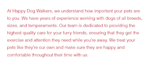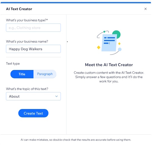 Here’s how it works: As above, the AI Text Creator asks you questions about your business and creates content based on your input. For example, if your business involves dog walking, Wix will create content related to dog walking services.