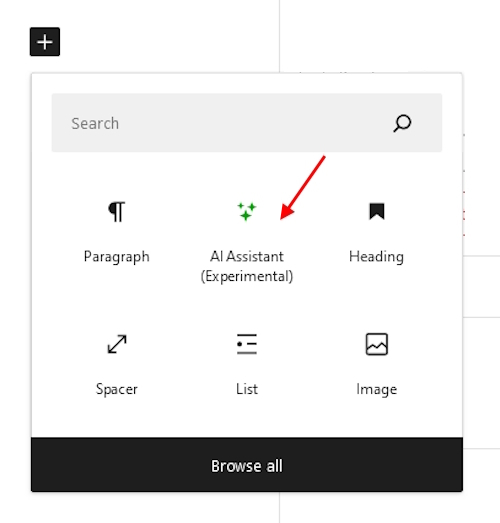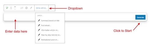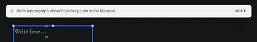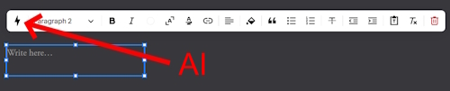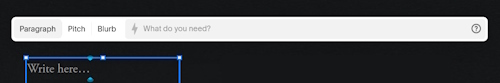 Adding a text block to your page launches this tool. Clicking on “Write here…” activates the tool.You launch the AI tool by adding a text block to your page, then clicking the AI symbol shown above. The AI tool reveals buttons to compose paragraphs, pitches, and blurbs based on your input: