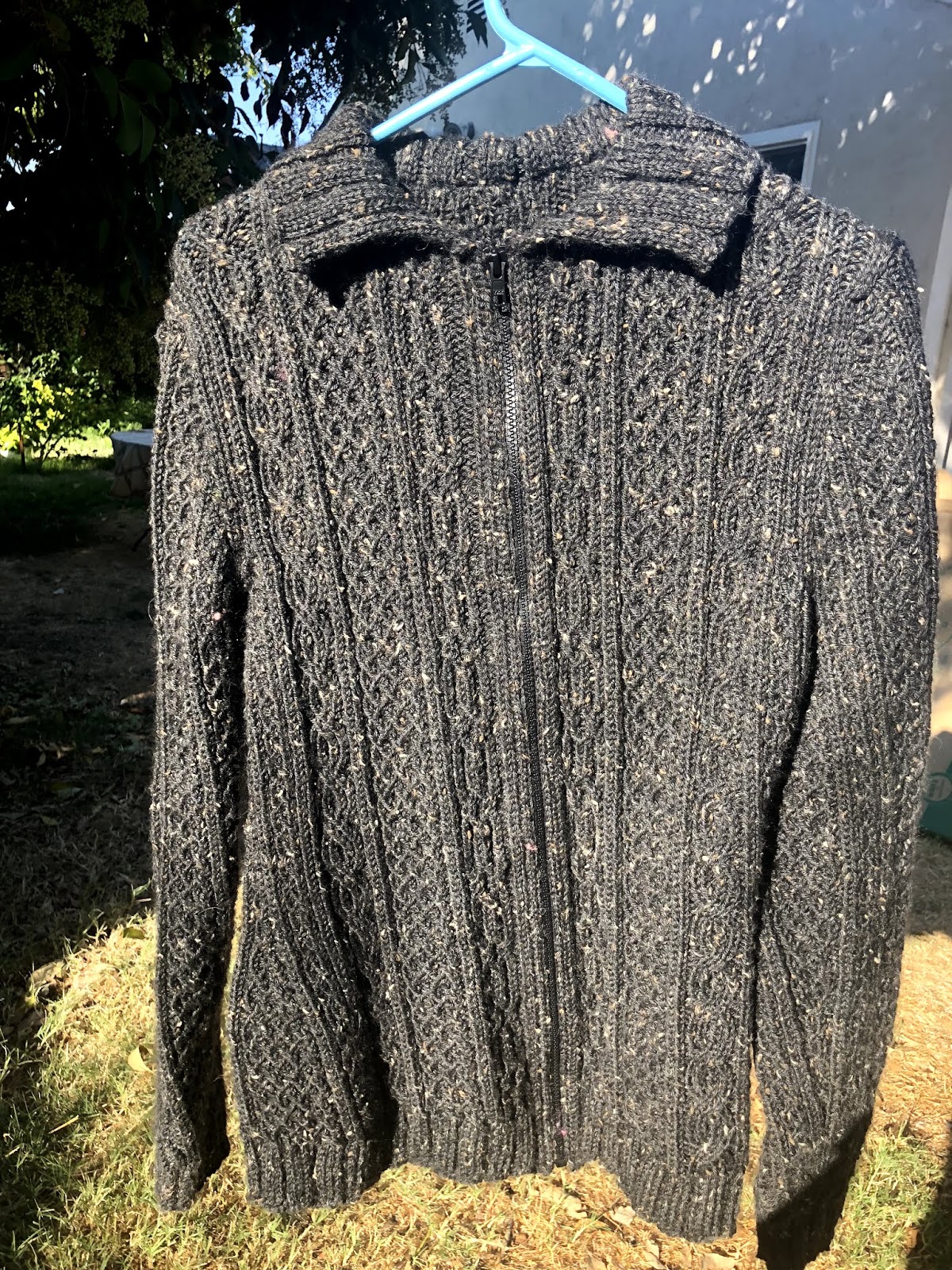 I wanted to publish this review a few weeks ago, but I ended up postponing it so that I could get good pictures of sewing the zipper. It was actually good I postponed, because I was able to really use the magnifier for the zipper. I hadn’t used the magnifier at all when knitting the sweater because the twisted stitches were pretty easy to see thanks to the bright light of the lamp, but the zipper was a different story since I was sewing it with needle and thread, and the thread was, of course, black.My finished sweater: